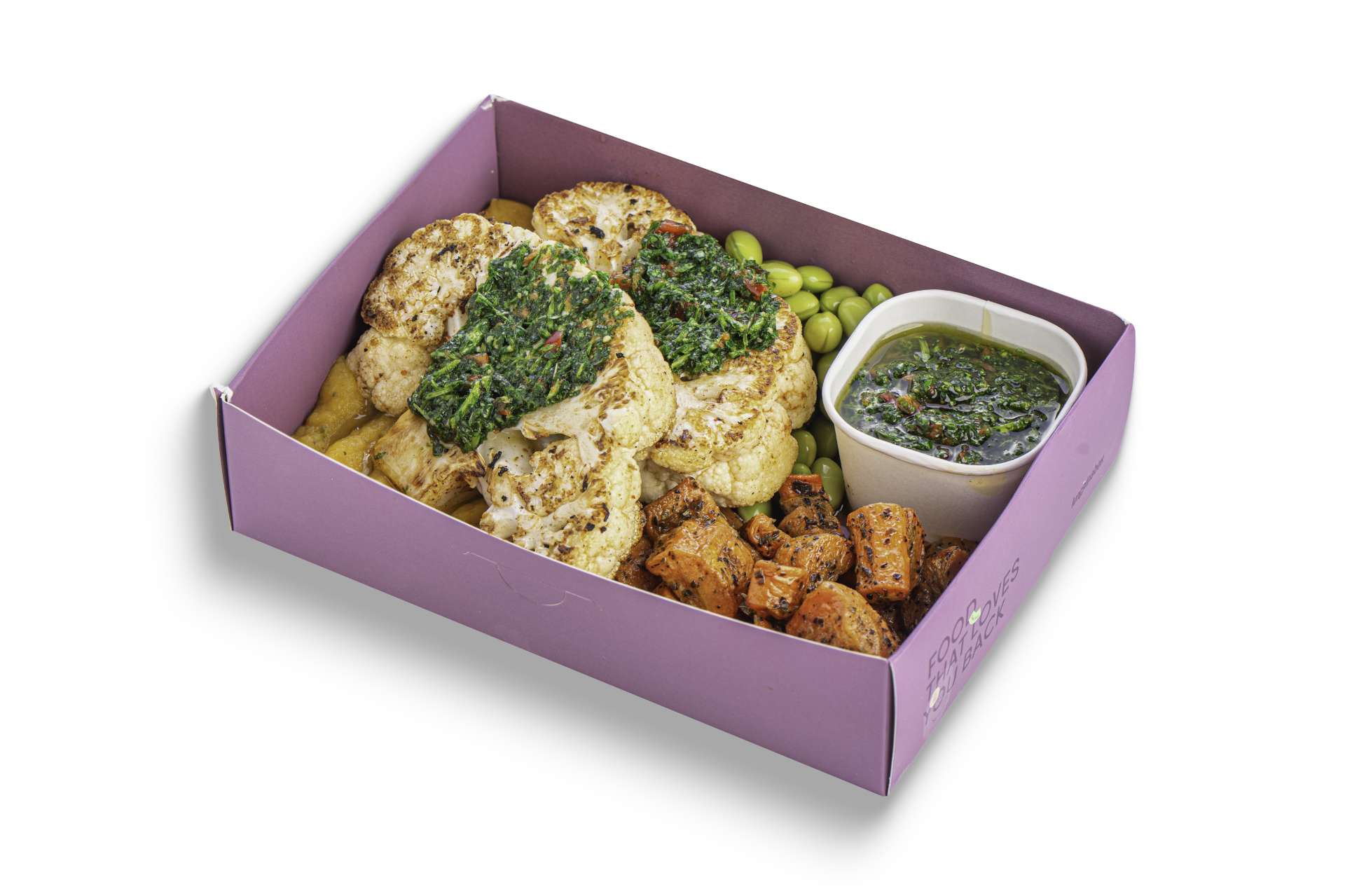 Mashed Sweet Potatoes, Grilled Cauliflowe, Edamame, Roasted Carrots, Chimichurri Sauce