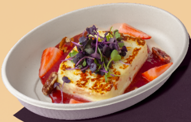 Halloumi Cheese, Strawberry Sauce, Micro Greens, Pecans, Fresh Strawberries